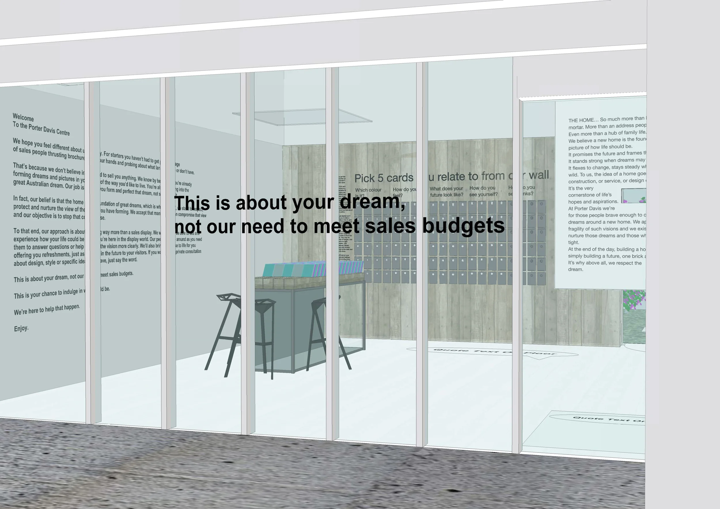 A zone to connect the immersive reality of the Porter Davis build with the promise of the invitation. Cut out view ports allow a glimpse into the “dream backyard” while Porter Davis’ manifesto text ignites and captures the emotions of customers on the journey to purchase a home.